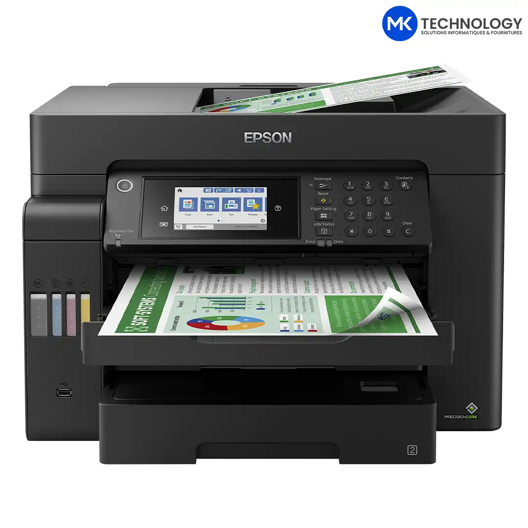 L’Epson EcoTank L15150 est une imprimante multifonction jet d’encre A3+ haut de gamme, conçue pour répondre aux besoins des entreprises, bureaux et professionnels exigeants. Grâce à son système EcoTank à réservoirs d’encre rechargeables, elle combine haute capacité, vitesse et économie, tout en garantissant une qualité d’impression professionnelle. Elle intègre les fonctions impression, copie, numérisation et fax, le tout avec une connectivité avancée.